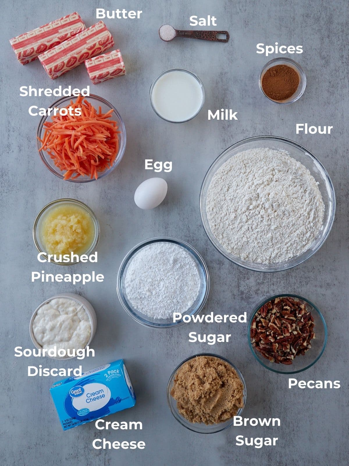 - Mix dough: In the bowl of a stand mixer or large bowl add all of the dough ingredients. The crushed pineapple does not need to be drained but I prefer to scoop it out of the can instead of pouring it to make sure to get some of the pineapple. 200 grams active and bubbly sourdough starter, 57 grams butter, melted, 80 grams whole milk, 140 grams canned crushed pineapple , 1 large egg, 160 grams shredded carrots, 55 grams brown sugar, 550 grams all-purpose flour, 5 grams salt