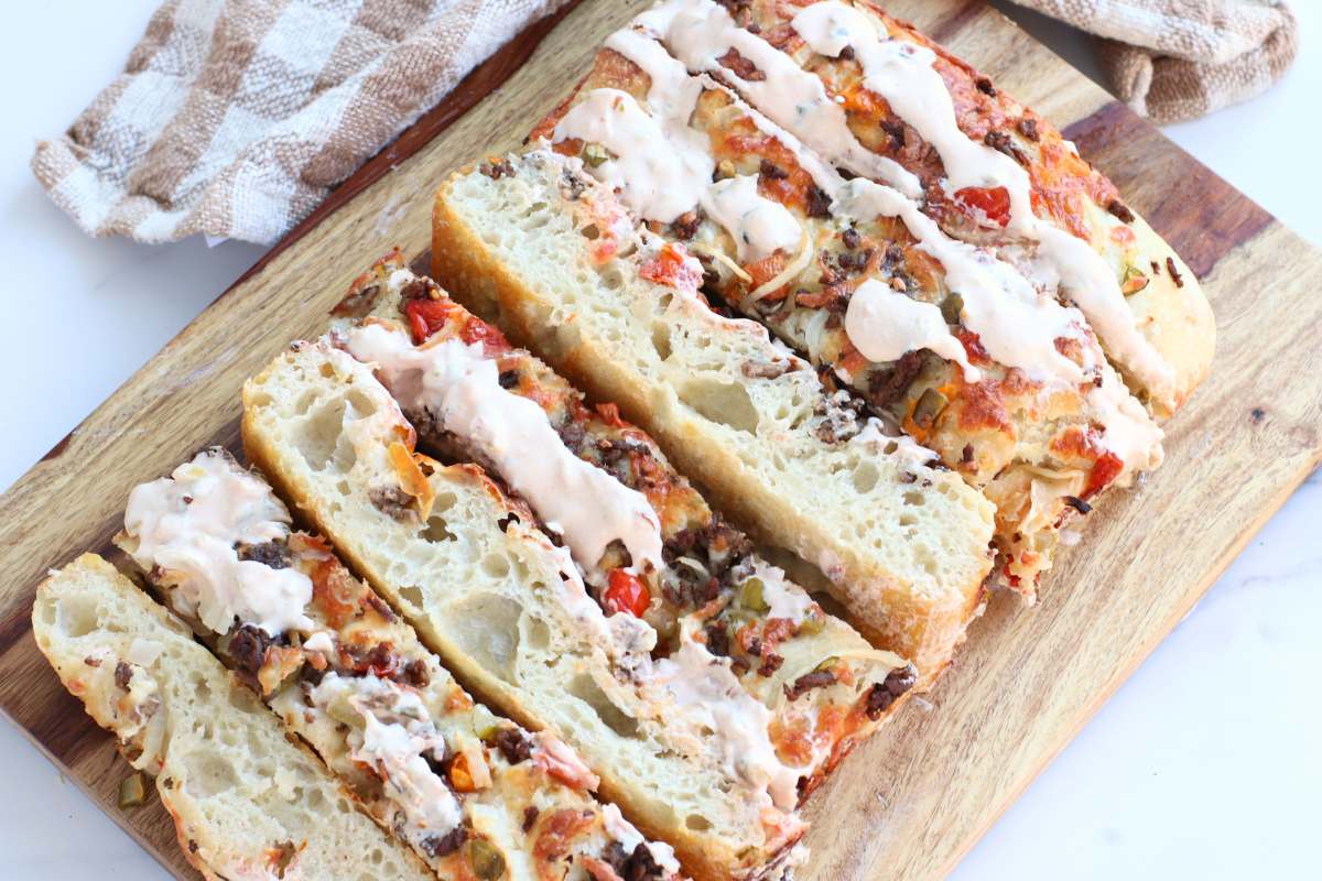 Step 9: Mix together the homemade burger sauce and drizzle over the focaccia. Cut and serve warm.
