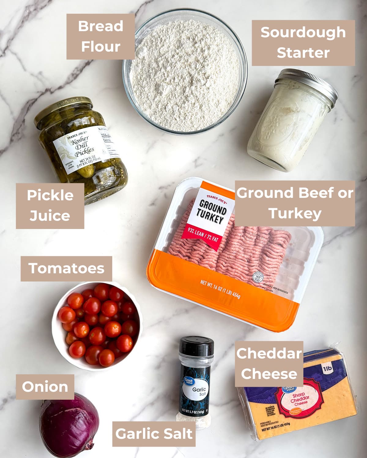 - Mix ingredients: In a bowl or straight-edge container, mix pickle juice, active and bubbly sourdough starter, and garlic salt with a danish dough whisk, spoon, or hands. Add the bread flour and mix until the flour is fully incorporated. The dough will be wet and sticky. Cover and let it sit at 75°F for 30 minutes.375 grams pickle juice (48oz jar of pickles) 175 grams active sourdough starter, 8 grams garlic salt, 500 grams bread flour