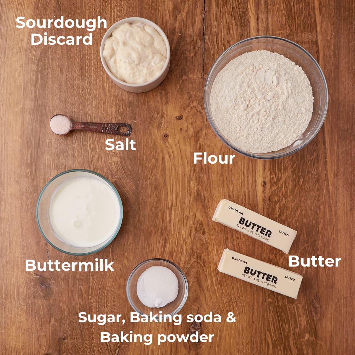 - Sourdough discard – Be sure to use cold sourdough discard to ensure the butter stays cold in the biscuits.