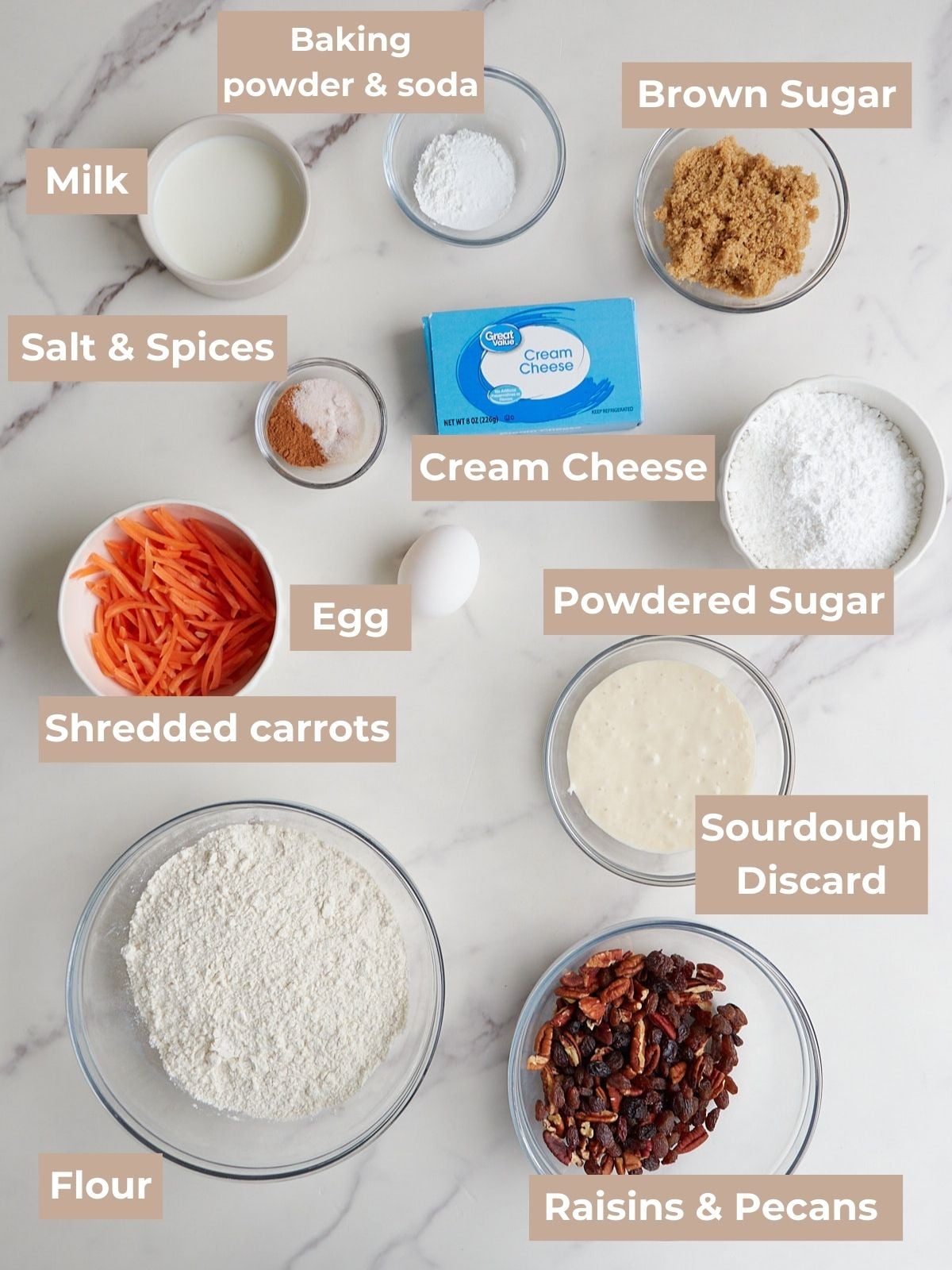 - Add mix-ins: Add in the shredded carrots, pecans, and raisins to the flour mixture and toss to combine.75 grams raisins, 60 grams pecans, chopped, 75 grams grated carrots
