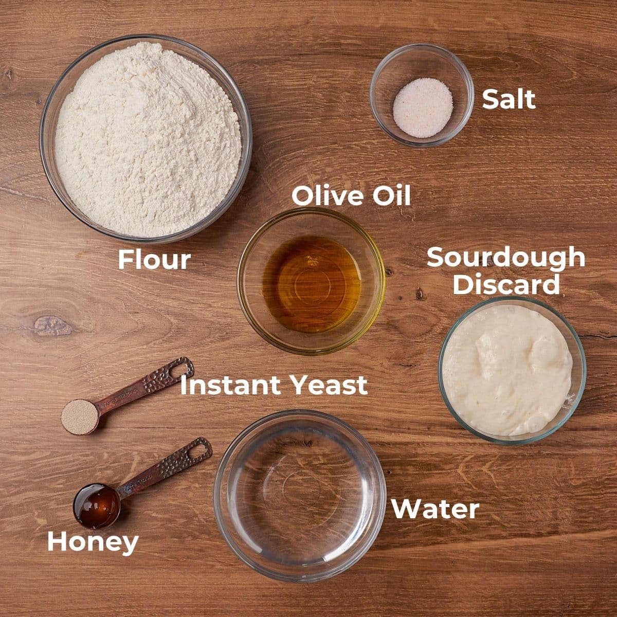 Ingredients for sourdough discard pizza dough in clear bowls on a wooden surface.