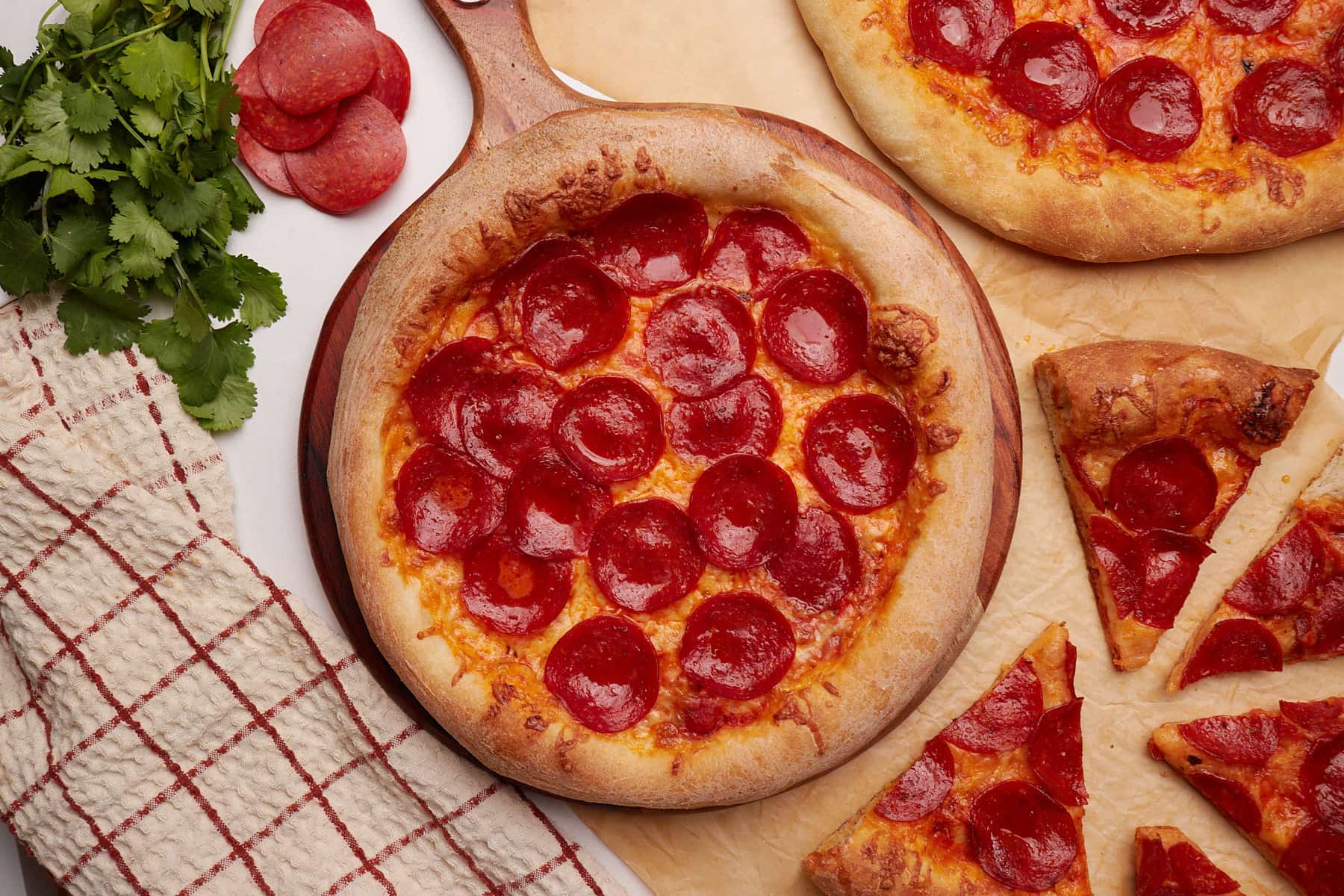 Pepperoni pizza made from sourdough discard pizza dough on a round wooden board next to more pepperoni pizza on parchment paper.
