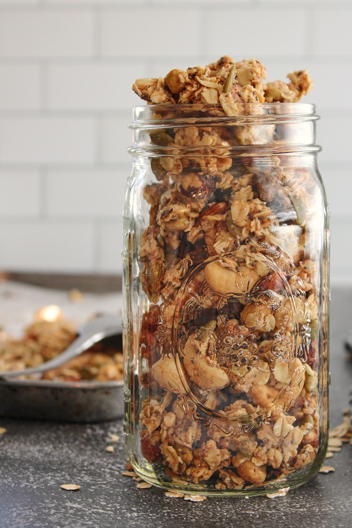 Granola lasts quite a while in an airtight container. Once the granola is completely cooled transfer to a container and leave on your counter or in the pantry. My personal preference is to use a large glass mason jar. Glass will keep your granola crunchier for longer but if needed you can use a plastic container or ziplock bag.