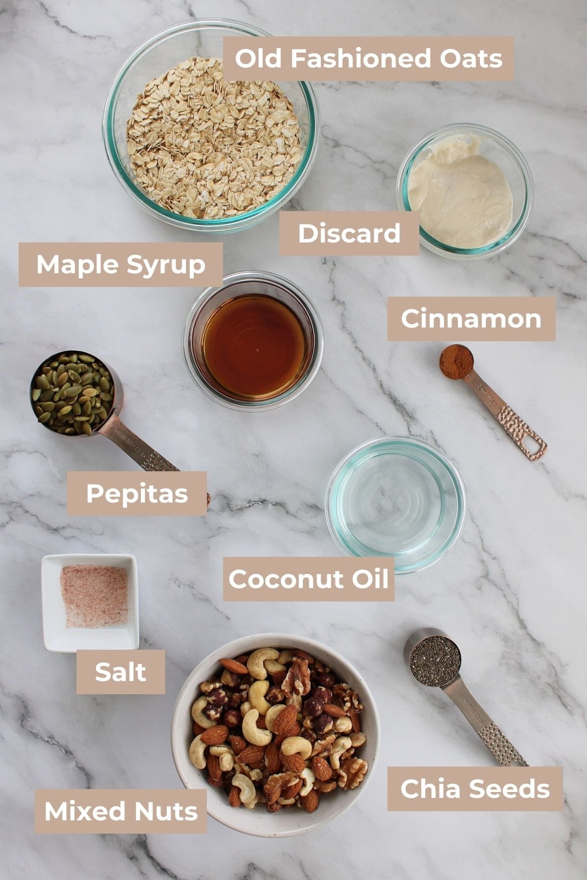 - Mix together all the dry ingredients in a large bowl.180 grams old-fashioned oats, 290 grams mixed raw nuts (your choice), 69 grams pepitas, 20 grams chia seeds, 6 grams salt, 2 grams cinnamon