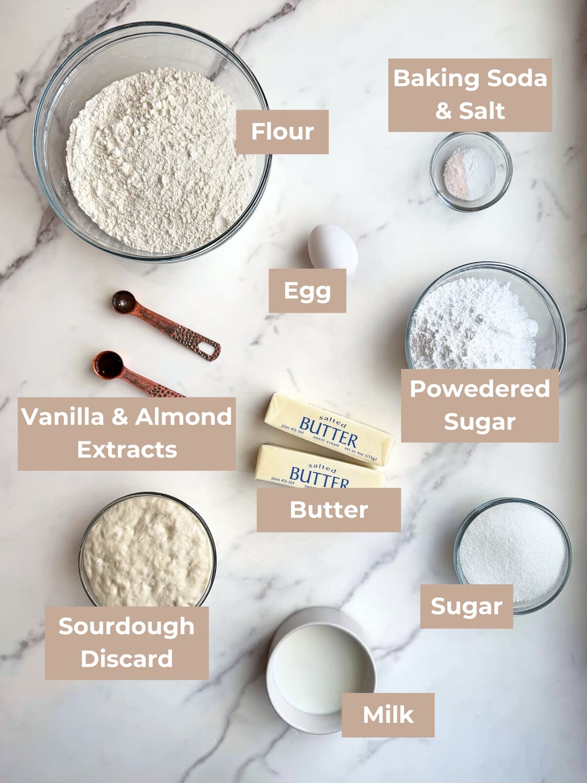 - Add in the egg, vanilla extract, almond extract, and sourdough discard. Scrape down the sides of the bowl to ensure everything is combined. If the ingredients are cold, the mixture will likely curdle; you don't need to mix until smooth. 1 large egg, 75 grams sourdough discard, 2 grams almond extract, 75 grams sourdough discard