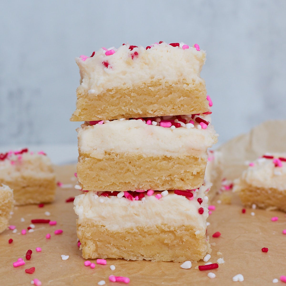 Sourdough Sugar Cookie Bars are soft, buttery, and sweet with a tender crumb that melts in your mouth. There’s no need to roll or cut out these; just press the dough into a pan and bake. Finish with buttercream frosting and sprinkles for a delicious, easy treat.