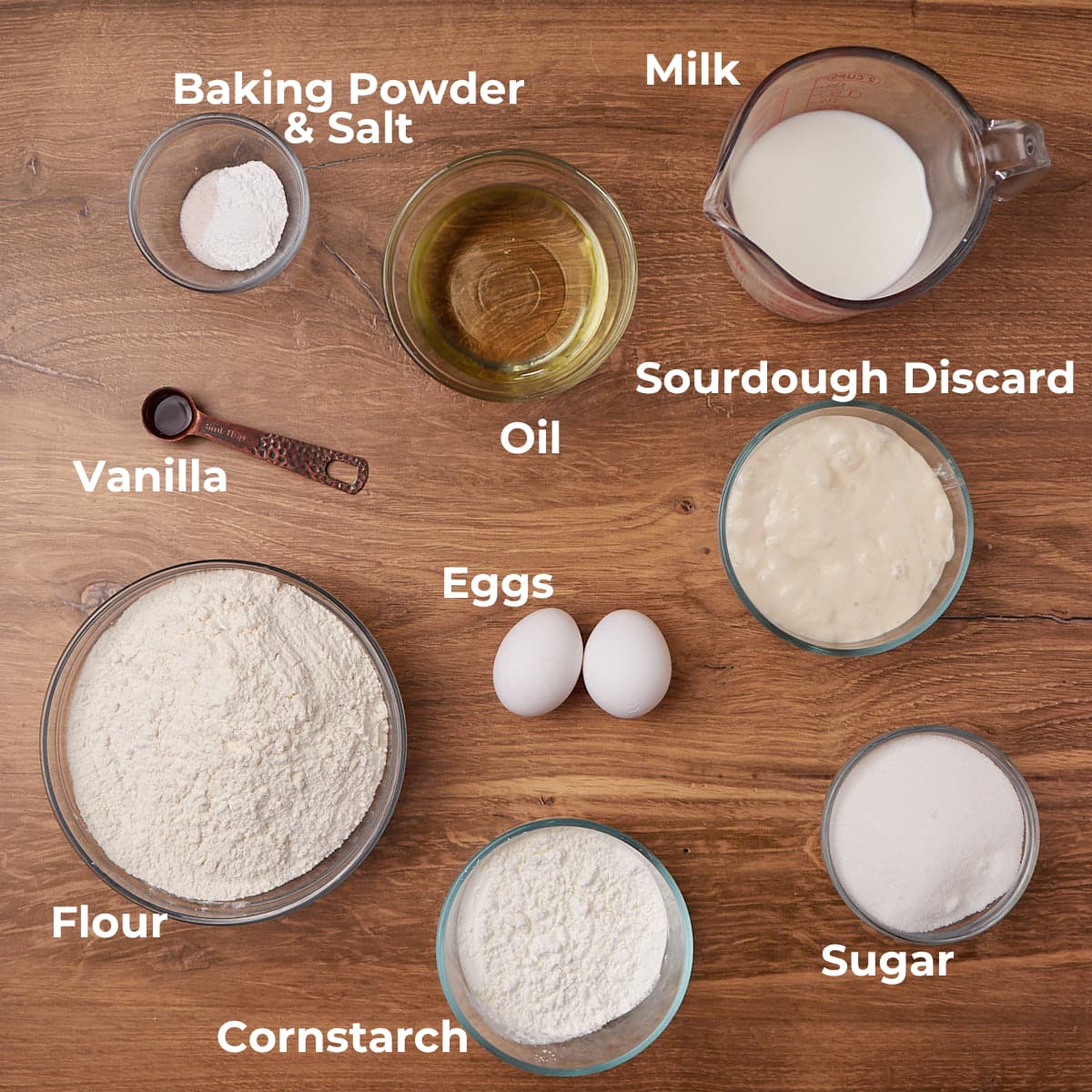 - Combine wet ingredients – In a large bowl, whisk the oil, milk, sourdough discard, vanilla, and eggs. Whisk to combine.80 grams oil (vegetable, canola, or olive oil will work) , 320 grams milk, 120 grams sourdough discard, 5 grams vanilla extract, 2 eggs