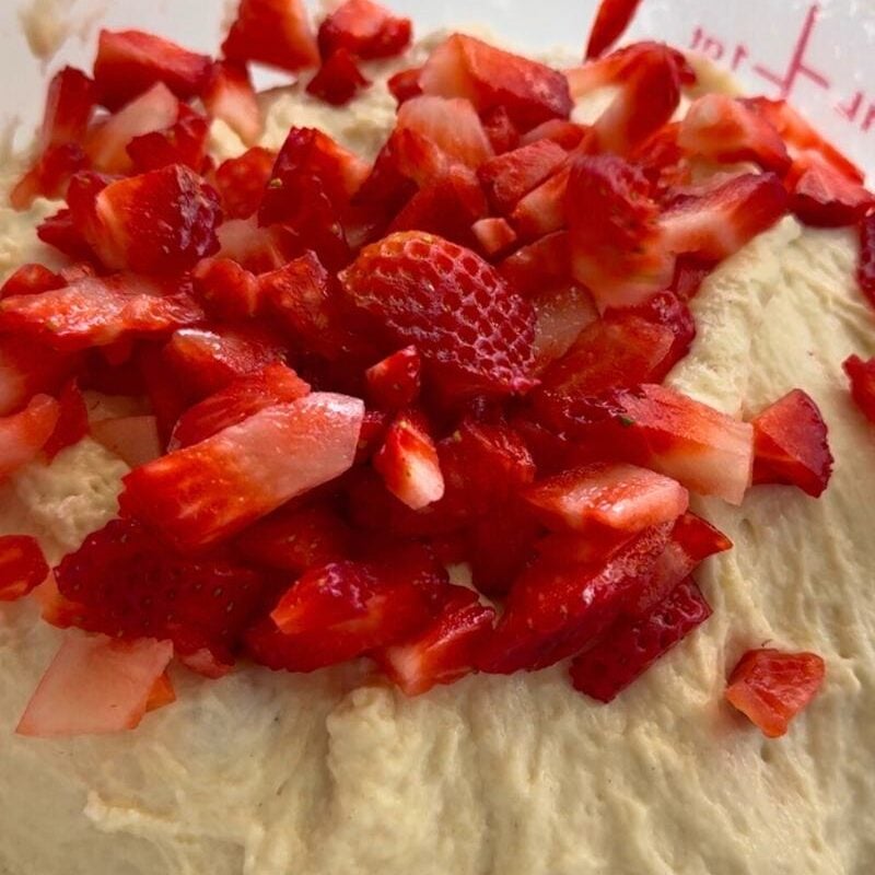 - Perform 2-3 sets of stretch and folds to develop the gluten in the dough with at least a 30 minute rest in between each set. Add the diced strawberries during the first set of stretch and folds. To stretch and fold the dough, grab one side with a damp hand and gently shimmy the dough up, and then fold it on itself. Repeat this 3 more times rotating the bowl 90 degrees each time.80 grams diced strawberries