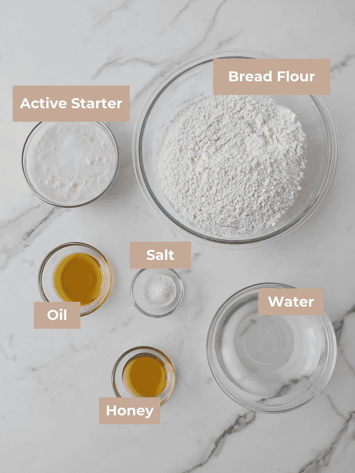 - Once the starter is doubled in size and ready to use, warm the water to 100℉. Add all the dough ingredients to a stand mixer with a dough hook or large bowl. If the dough is very sticky, add a little extra flour until the dough is tacky. 330 grams water, 30 grams honey or sugar, 240 grams levain or active sourdough starter, 30 grams olive oil , 10 grams salt, 700 grams bread flour